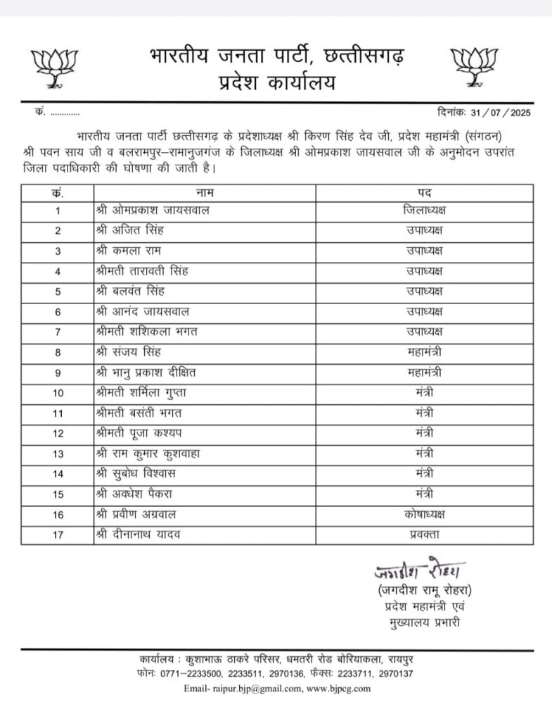 बलरामपुर-रामानुजगंज। छत्तीसगढ़ में भारतीय जनता पार्टी संगठन विस्तार की प्रक्रिया को लगातार गति दे रही है। इसी क्रम में शुक्रवार को बलरामपुर-रामानुजगंज जिले के लिए भाजपा की नई जिला कार्यकारिणी की घोषणा की गई। यह घोषणा प्रदेशाध्यक्ष किरण सिंह देव, प्रदेश संगठन महामंत्री पवन साय और जिलाध्यक्ष ओमप्रकाश जायसवाल की सहमति के पश्चात प्रदेश कार्यालय द्वारा की गई।