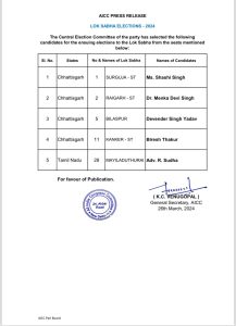 Khabarwaad Raipur: कांग्रेस ने छत्तीसगढ़ की बची 4 सीटों पर उम्मीदवारों का ऐलान कर दिया है। जबकि लिस्ट में तमिलनाडू की एक सीट पर प्रत्याशी की घोषणा की गई है।