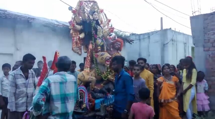 Chhattigarh News : जिले के नवागढ़ जनपद पंचायत अंतर्गत ग्राम पंचायत कुथूर में बड़े ही धूमधाम के साथ दुर्गा विसर्जन किया गया। इस दौरान बाजे-गाजे के साथ गांव के छोटे-छोटे बच्चों सहित सैकड़ो महिला-पुरुष दुर्गा विसर्जन में सम्मिलित हुए। जहां पर माता रानी का भजन कीर्तन करते हुए गांव की गलियों से घूमते हुए बड़े ही उत्साह के साथ दुर्गा विसर्जन किया गया।