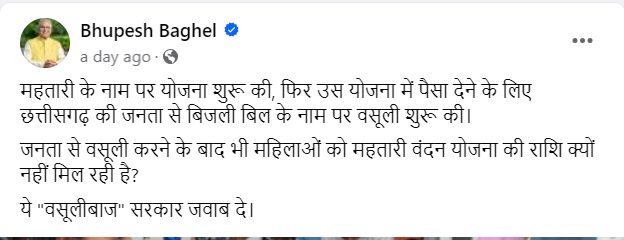 Chhattisgarh Political News:  सोशल मीडिया पोस्ट पर पूर्व मुख्यमंत्री भूपेश बघेल की ओर से लिखा गया- महतारी के नाम पर योजना शुरू की, फिर उस योजना में पैसा देने के लिए छत्तीसगढ़ की जनता से बिजली बिल के नाम पर वसूली शुरू की। जनता से वसूली करने के बाद भी महिलाओं को महतारी वंदन योजना की राशि क्यों नहीं मिल रही है? ये “वसूलीबाज” सरकार जवाब दे।