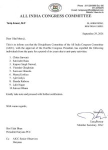 Haryana Election 2024 : हरियाणा कांग्रेस ने पार्टी विरोधी गतिविधियों में शामिल पाए जाने पर सख्त कार्रवाई करते हुए 10 नेताओं को 6 साल के लिए पार्टी से निष्कासित कर दिया है। यह फैसला अखिल भारतीय कांग्रेस कमेटी (AICC) की मंजूरी के बाद लिया गया है। पार्टी ने इन नेताओं पर पार्टी विरोधी कार्यों में संलिप्तता का आरोप लगाया, जिससे कांग्रेस की छवि और संगठन को नुकसान पहुंचा। कांग्रेस नेतृत्व ने स्पष्ट किया है कि पार्टी अनुशासनहीनता को किसी भी सूरत में बर्दाश्त नहीं करेगी।