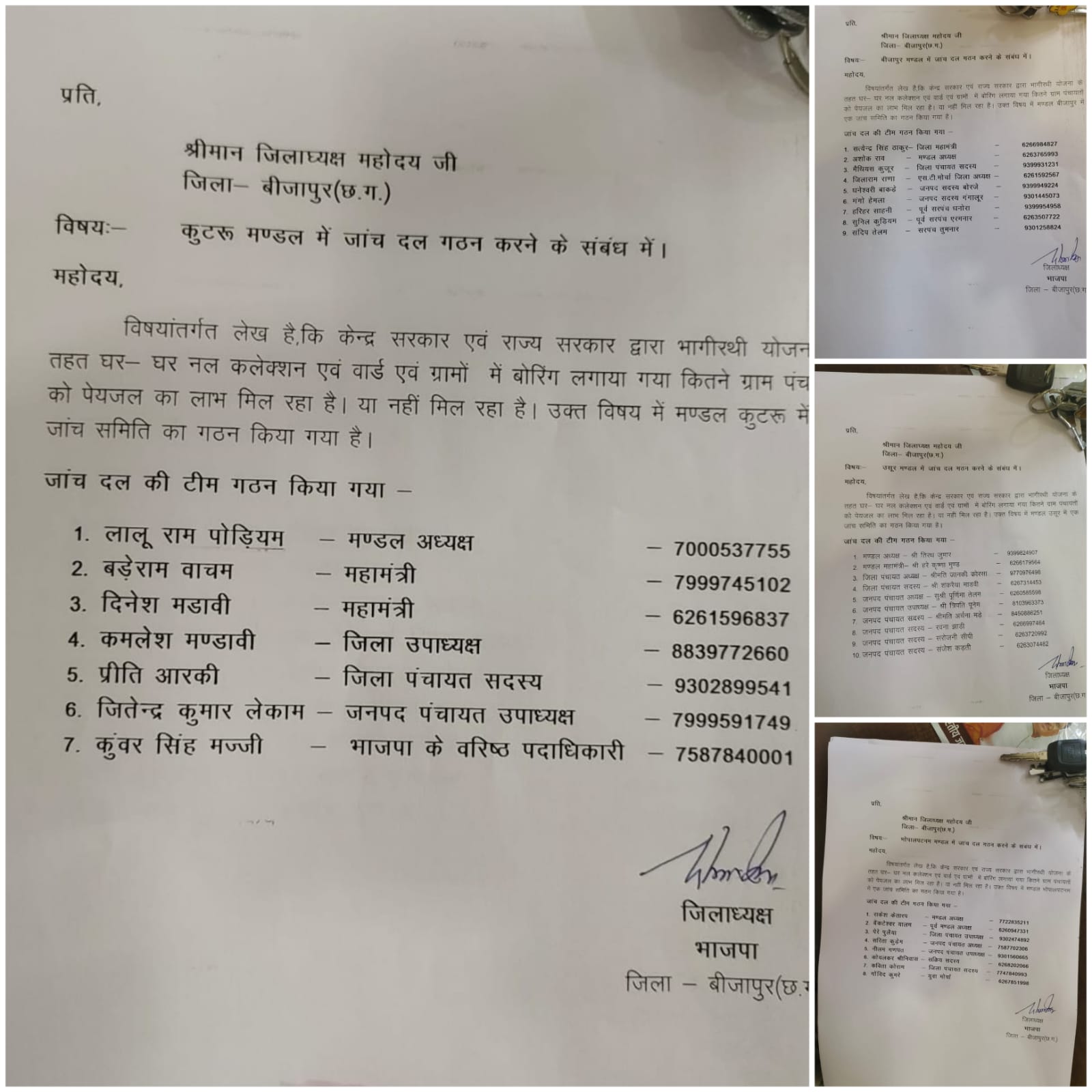 बीजापुर. आशीष पदमवार। केंद्र व राज्य सरकार की महत्वपूर्ण नल-जल योजना को लेकर बीजापुर से अनियमितता की खबर सामने आने के बाद आज भाजपा जिलाध्यक्ष ने जाँच दल की घोषणा कर दी। जांच दल में जिले के चारो मंडलो बीजापुर, भोपालपटनम, उसूर और कुटरू से कुल 34 सदस्य शामिल किये गए है जो जाँच कर जिलाध्यक्ष को रिपोर्ट सौपेंगे।जिसके आधार पर संबधित अधिकारियों और ठेकेदारों पर कार्यवाही के लिए कलेक्टर महोदय को अनुशंसा की जाएगी।भाजपा जिलाध्यक्ष घासी राम नाग ने कहा है कि जिले भर में इस योजना के तहत हुए कामों का मंडल स्तर पर टीम गठित कर निरीक्षण के लिए भेजा जाएगा। यहां गठित टीमें कार्यों की गुणवत्ता की जांच की जाएगी। इसके अलावा लोगों से फीड बैक भी लिया जाएगा।