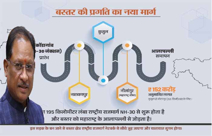 उन्होंने बताया कि यह सड़क न केवल बस्तर और महाराष्ट्र के बीच सीधी और सुरक्षित कनेक्टिविटी सुनिश्चित करेगी, बल्कि नक्सल प्रभावित क्षेत्रों में सुरक्षित और सुगम यातायात भी सुनिश्चित करेगी।