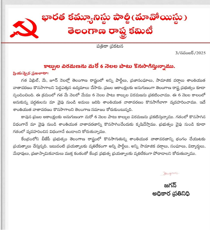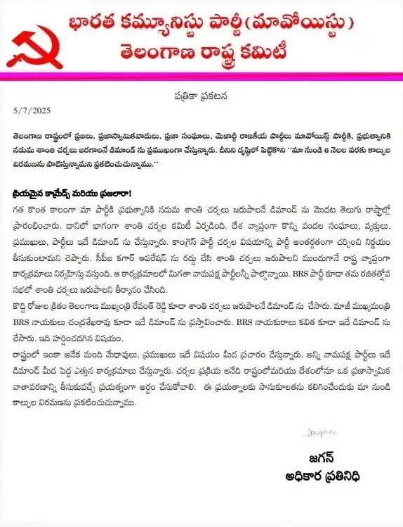 प्रेस नोट में नक्सल संगठन ने यह भी कहा है कि वे राज्य में शांति और संवाद की प्रक्रिया को आगे बढ़ाने के लिए प्रतिबद्ध हैं। साथ ही तेलंगाना सरकार से अपील की है कि वह भी पहले की तरह सहयोग और संयम बनाए रखे।
