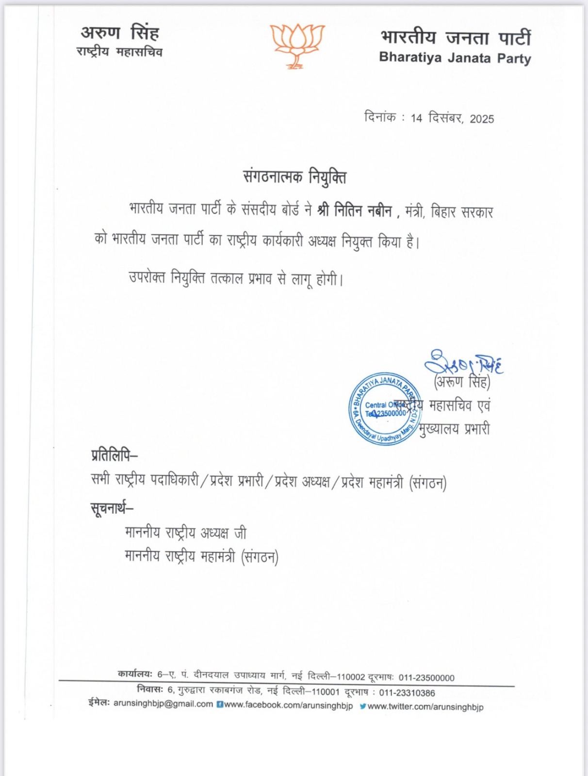 नेशनल डेस्क। भारतीय जनता पार्टी के संसदीय बोर्ड ने बिहार सरकार में मंत्री नितिन नबीन को पार्टी का राष्ट्रीय कार्यकारी अध्यक्ष नियुक्त किया है। पार्टी की ओर से जारी आदेश के अनुसार यह नियुक्ति तत्काल प्रभाव से लागू होगा।
