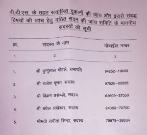 पांच सदस्यो की इस समिति के सभापति पूर्व खाद्य मंत्री पुन्नू लाल मोहिले को बनाया गया है। समिति में दो अन्य मंत्री राजेश मूणत और विक्रम उसेंडी को रखा गया है। कांग्रेस के लखेश्वर बघेल और संगीता सिन्हा को जांच समिति में है। समिति के सचिव दिनेश शर्मा, विधानसभा सचिव रहेंगे।