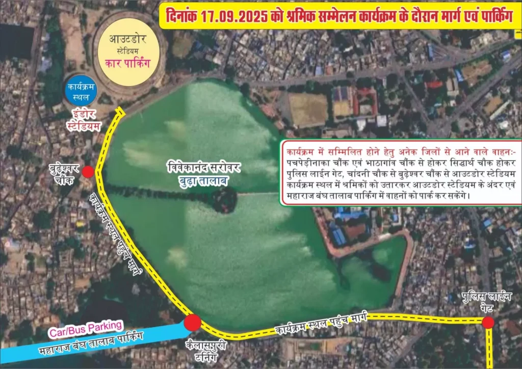 महराजबंध तालाब मार्ग में पर्याप्त पार्किंग स्थान सुनिश्चित किया गया है। पार्किंग स्थल पर पुलिस और स्वयंसेवी संगठनों का सहयोग रहेगा। श्रमिकों के लिए स्टेडियम तक पैदल मार्ग उपलब्ध होगा। साइन बोर्ड, लाउडस्पीकर और स्वयंसेवकों की मदद से मार्गदर्शन प्रदान किया जाएगा। पुलिस प्रशासन ने सुनिश्चित किया है कि सम्मेलन के दौरान यातायात और सुरक्षा व्यवस्था में कोई असुविधा न हो।