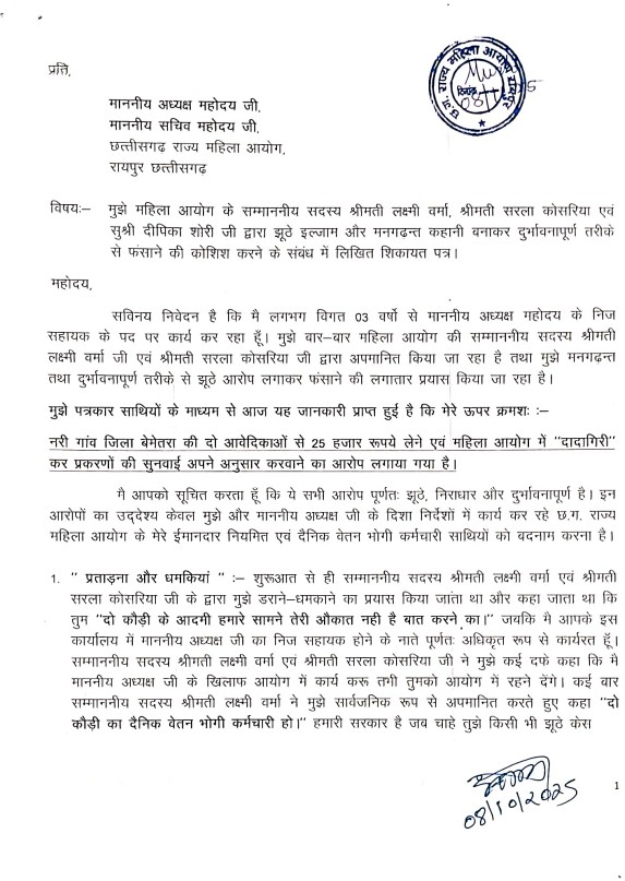 अभय सिंह ने तीनों सदस्यों पर आरोप लगाया कि उन्होंने उन पर बेमेतरा जिले की दो महिलाओं से 25 हजार रुपए रिश्वत लेने का झूठा आरोप लगाया। उनका कहना है कि इस संबंध में कोई शिकायत आयोग में दर्ज नहीं है और न ही संबंधित महिलाओं ने ऐसी कोई बात कही। PA ने दावा किया कि आवेदिकाओं के फर्जी हस्ताक्षर कर RTI फाइल की गई, जो आयोग के पूर्व कर्मचारी राघवेंद्र साहू द्वारा तैयार की गई थी। अभय सिंह के अनुसार, यह सब सदस्य लक्ष्मी वर्मा के निर्देश पर किया गया, ताकि उन्हें और अध्यक्ष को बदनाम किया जा सके।