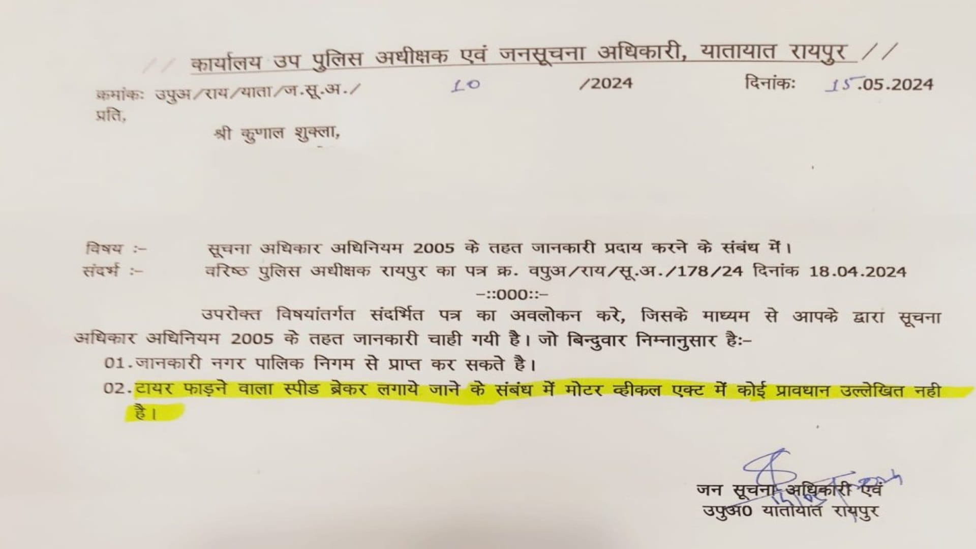 उन्होंने इस संबंध में पूछा था कि टायर किलर कौन से मोटर वीकल एक्ट के तहत लगाया गया है? जवाब में कार्यालय उप पुलिस अधीक्षक एवं जनसूचना अधिकारी यातायात रायपुर ने ये बताया कि टायर फाड़ने वाले स्पीड ब्रेकर लगाए जाने के संबंध में मोटर वीकल एक्ट में कोई प्रावधान नहीं हैं। इस संबंध में रायपुर नगर निगम से जानकारी ले सकते हैं।