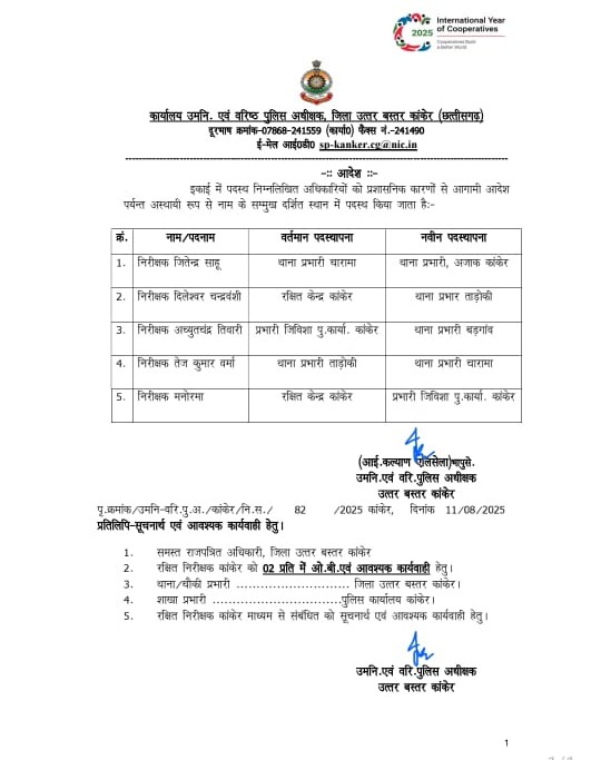 इसके अलावा, दिलेश्वर चंद्रवंशी को रक्षित केंद्र से ताड़ोकी थाना प्रभारी, अच्युतचंद्र तिवारी को जीविशा पुलिस कार्यालय से बड़गांव थाना प्रभारी, जबकि मनोरमा को रक्षित केंद्र कांकेर से जीविशा पुलिस कार्यालय का प्रभारी बनाया गया है।